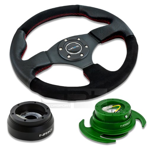 NRG-SRK-181H+012R-S+650GR, NRG Innovations 12.5" 320mm Black Leather Red Stitch Suede Grip Racing Steering Wheel Combo with 6 Hole Short Hub Adapter with Gen 3.0 with Handle Green Quick Release Kit SRK-181H