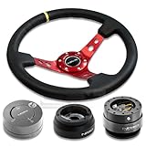 | ✚✚✚ NRG-SRK-181H+200GM+101GM+006RDY, NRG Innovations 13.78" 350mm 3" Deep Dish Style Black Leather Yellow Center Marking Red Spokes Racing Steering Wheel Combo with 6 Hole Short Hub Adapter with Gen 2.0 Gun Metal Quick Release with Gun Metal Lock Hub Kit SRK-181H NRG Quick Release features many options that conventional ball-locking quick release system do not. It is specially engineered with raised sections to prevent the scratching and stretching of the hub while a self locking feature adds increased safety and functionality. Features racing styled for added style and look. Each unit is made from the highest quality aircraft grade aluminum and is anodized for maximum durability and finish.